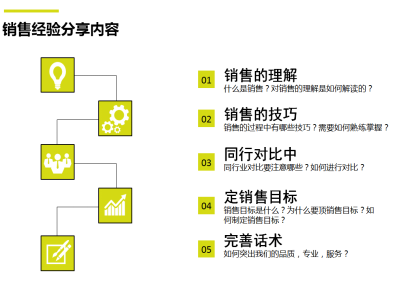作为鹰诺达人我们心存梦想和使命,我们深知不断进步是生存的必备条件,沉淀是为了创造更好的自己。让分享成为常态,让学习成为习惯。从自己做起,从身边人学起。此次分享大致内容如右图所示;简单普及销售理解;关于销售技巧中一些个人经验和感悟;同行对比中保持客观和理性;合理定制销售目标;完善话术标准和服务质量。