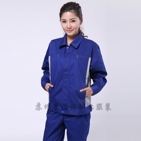 苏州鹰诺服装:艳蓝配浅灰涤棉纱卡仓库工作服AC081-CC