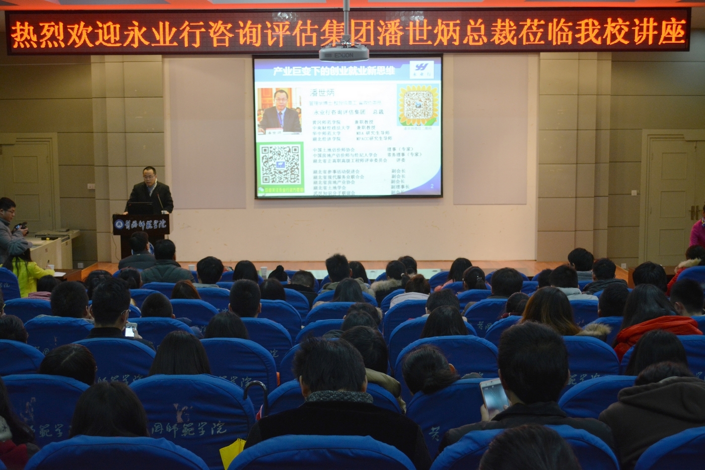 1224,应黄冈师范学院商学院的邀请,永业行总裁潘世炳在黄冈师范学院学术报告厅B03室作了题为“产业巨变下的创业就业新思维”的讲座,商学院师生参加了讲座。
