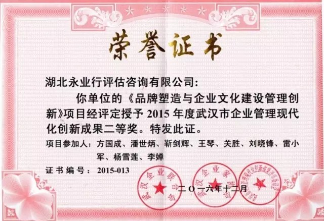 在此次评选中,永业行作为民营企业与在汉央企、本地大型国企进行角逐并最终获奖,也是唯一获奖的咨询评估服务业机构。永业行自成立以来,不断加强永业行建设,丰富永业行内涵,将品牌塑造与文化建设相结合,并将其工作落到实处,使其渗入到每个员工的价值观念中去,从而增强了公司竞争实力,实现了持续稳定健康地发展目标。