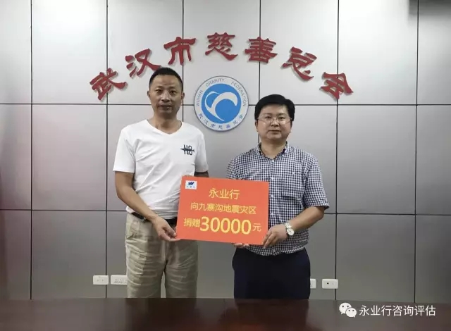 2017年8月8日21时,四川阿坝州九寨沟县发生7.0级地震,造成19人死亡,247人受伤。灾情牵动着全国人民的心。永业行集团在得知灾情后,迅速发起了“心系九寨沟”赈灾捐款活动,截止8月25日,总部及各分部员工通过现金捐赠、微信转账等方式,共计捐赠善款30000元。8月28日,公司助理总裁雷小军一行专程将募得的善款送到武汉市慈善总会,用于支持九寨沟地震救援和灾后重建。