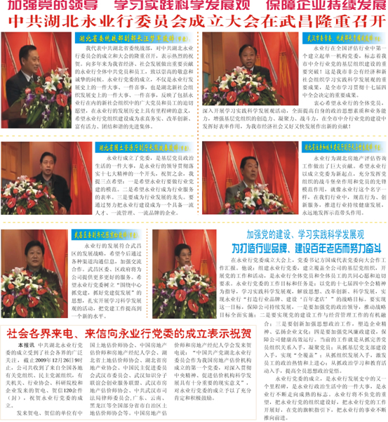 2009年12月26日,中国共产党湖北永业行委员会成立大会在武昌隆重召开。湖北永业行党委副书记、总裁潘世炳主持本次会议,中国土地估价师协会副会长秦海荣专程赴武汉致贺,大会在庄严的国歌声中开幕。