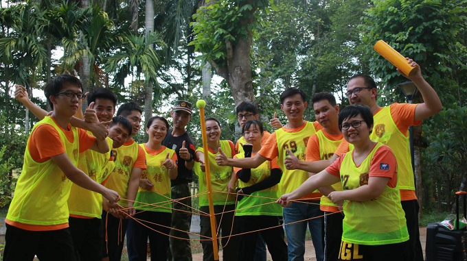 首先,教练向大家讲解了户外拓展活动的活动精神及具体规则,并以轻松有趣的热身方式对全体人员进行分组。本次活动团队分为三组(破冰队、无敌队、野狼队),各团队通过集体讨论,分别制定了口号、队歌,绘制队旗,并逐一展示团队风采。随后在教练的指导下,各组队员相互配合、团结协作,共同完成了“无轨列车”、“极速60秒”、“水涨船高”、“穿越电网”等一系列激发团队潜能、熔炼团队智慧的拓展项目,以及CS镭战、射箭对战等团队竞技活动。