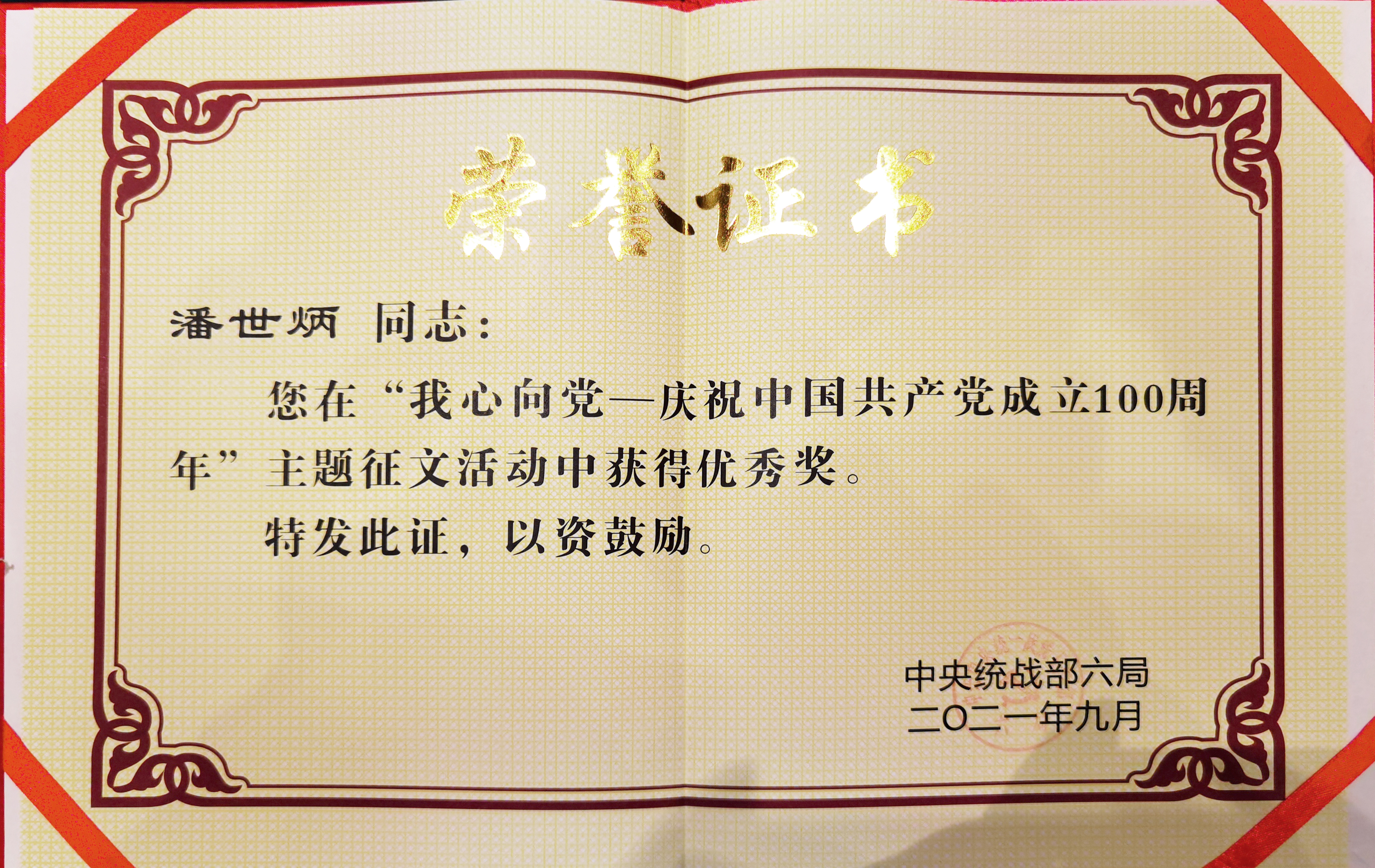 永业行潘世炳荣获中央统战部主题征文优秀奖