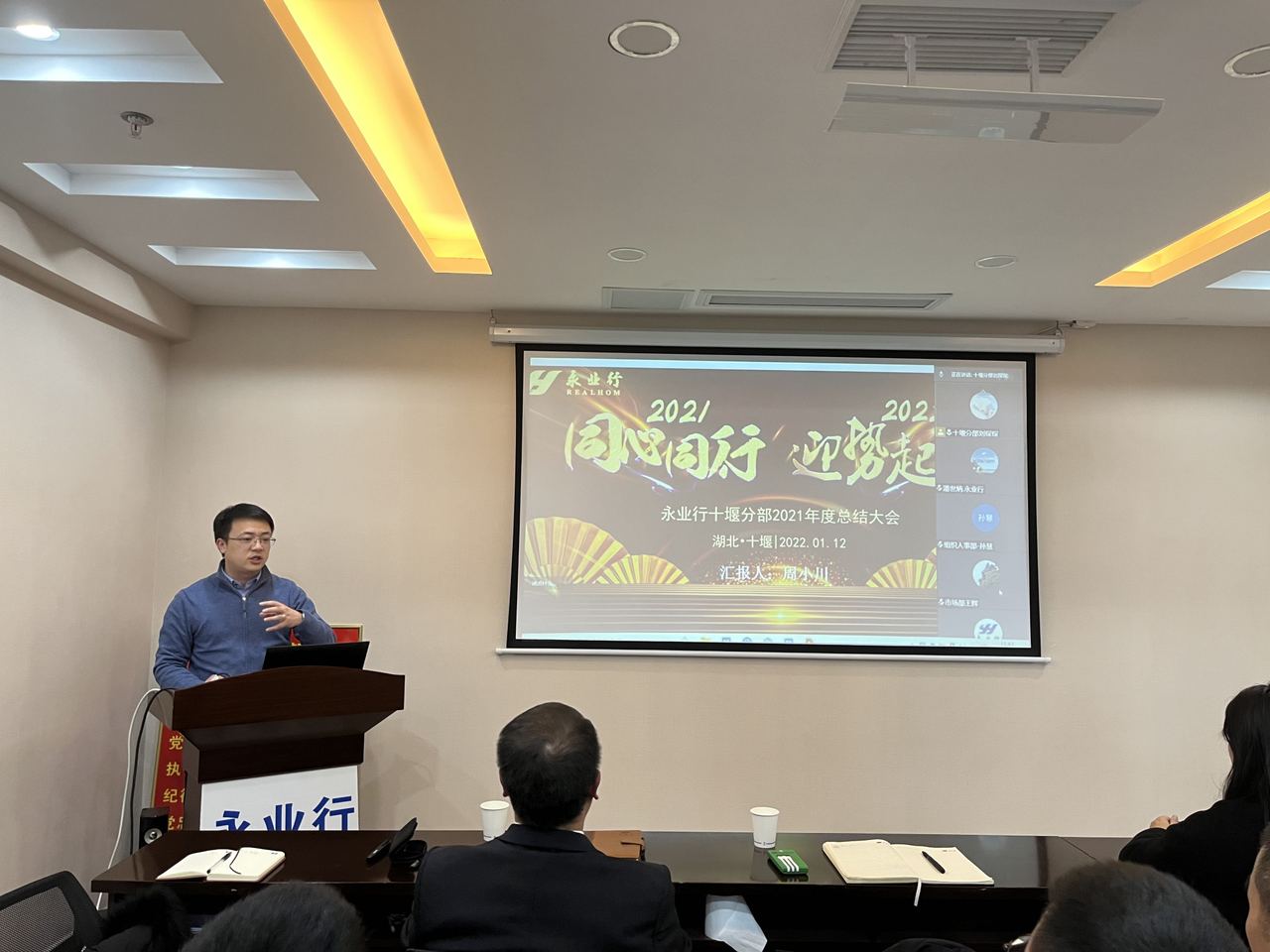 2022年1月12日下午,永业行十堰分部召开2021年年终总结会。永业行董事长潘世炳、副总裁文云波,十堰分部总经理周小川,总部各职能部门负责人及代表、十堰分部全体员工以线上线下形式参加会议。