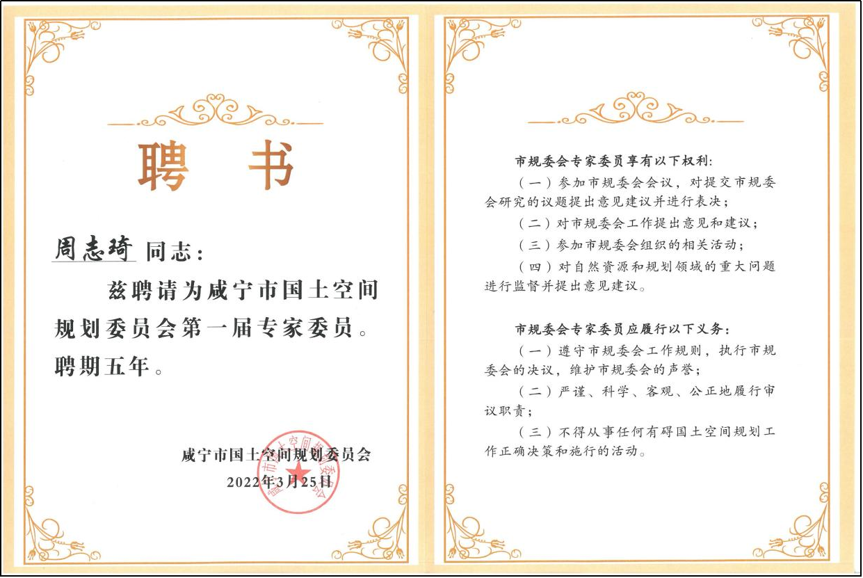 经咸宁市国土空间规划委员会公开广泛征集、认真遴选审查,近日,永业行咸宁分部总经理周志琦受聘为咸宁市第一届国土空间规划委员会专家委员,4月20日,咸宁市自然资源和规划局党组书记、局长杨杉为其颁发了聘书。