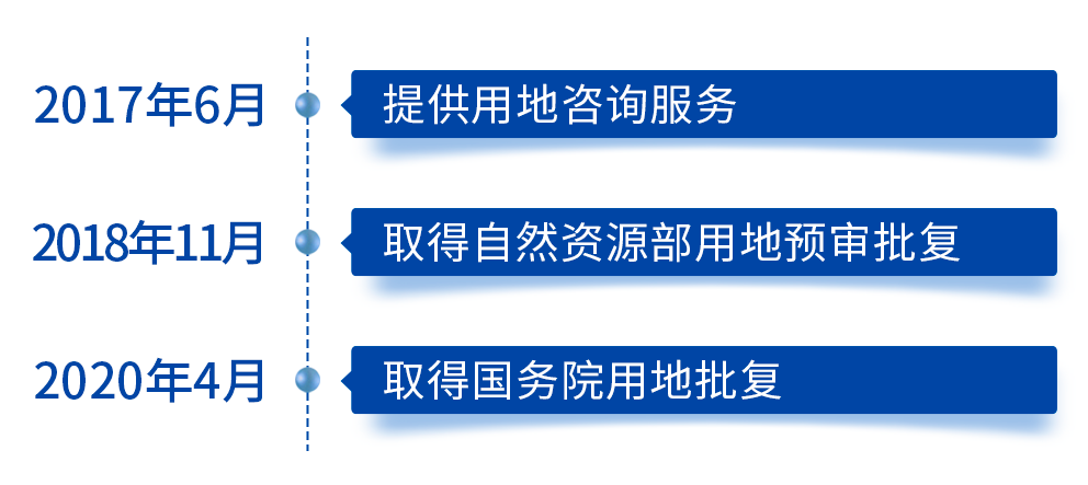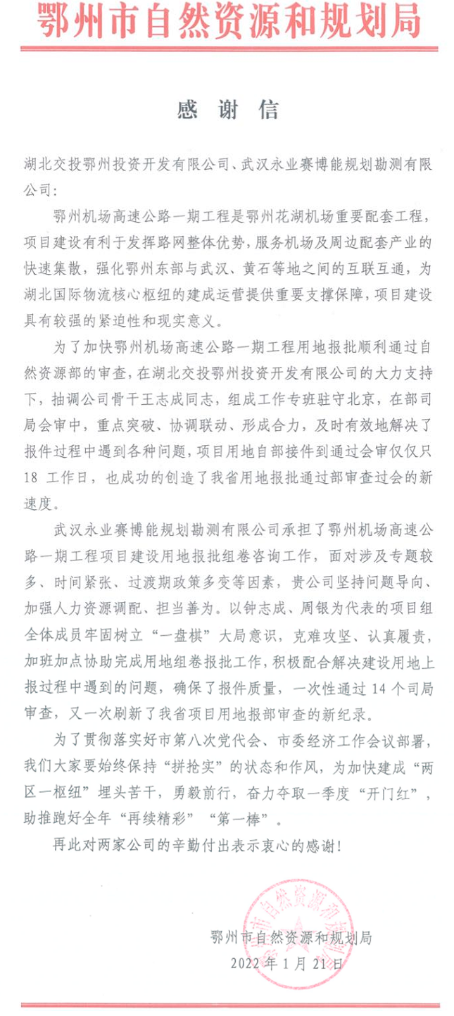 2017年6月我司开始为鄂州机场提供用地咨询服务。由于项目用地规模较大、行业跨度较大、功能分区复杂,技术团队先后去成都天府机场以及北京民航向专家请教学习。并于2018年11月取得了自然资源部用地预审批复,紧接着在2020年4月取得了国务院用地批复。同时也为鄂州机场对外连接的主要通道-鄂州机场高速一期工程提供专业服务,顺利取得了国务院及自然资源部用地预审批复。除此之外我司还成功为鄂黄第二过江通道、鄂咸高速、新港高速、武阳高速等重大基础设施项目提供了用地咨询服务。2022年1月鄂州市自然资源和规划局向我司发来了感谢信。