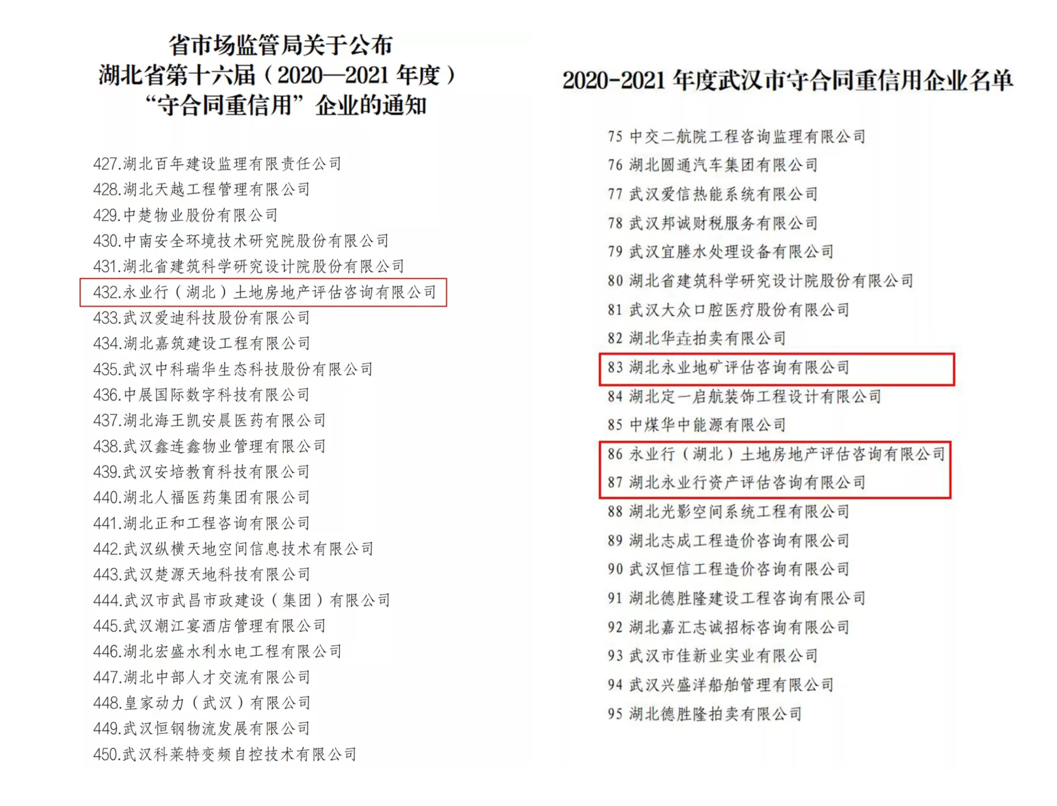 近日,湖北省市场监督管理局、武汉市市场监管局公布了2020-2021年度“守合同重信用”企业名单。永业行多家公司榜上有名,连续十二年获评省市两级“守合同重信用企业”。