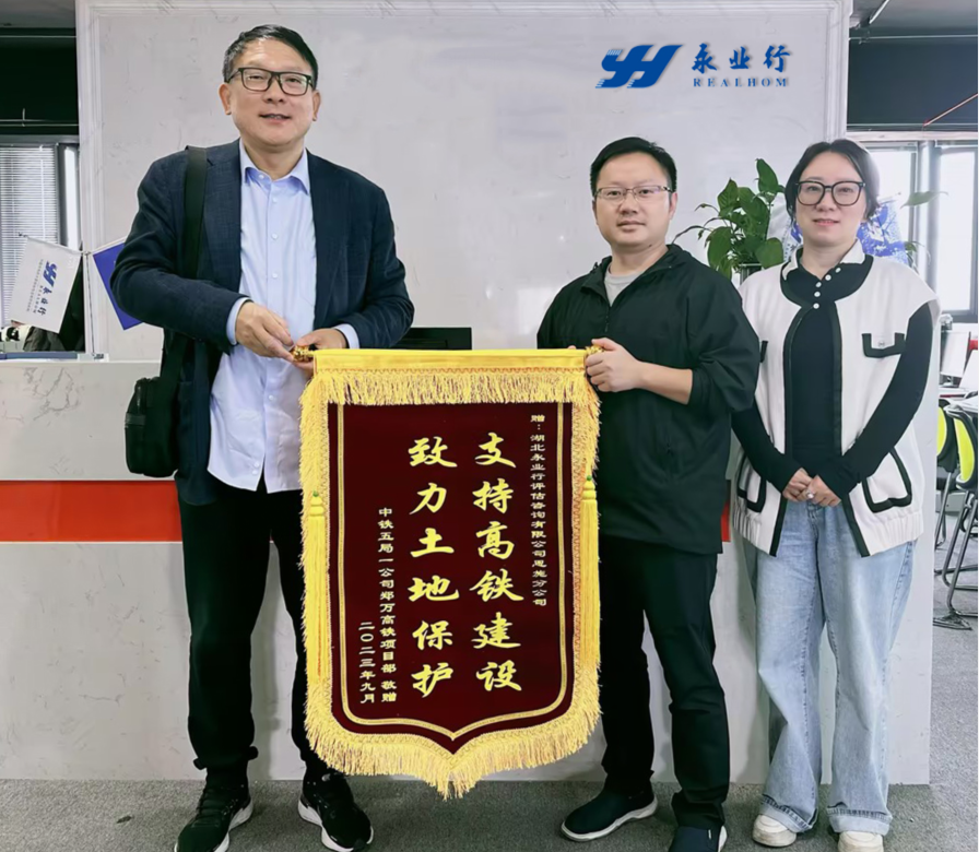 10月7日,中铁五局一公司郑万高铁项目部一分部工会主席王勇莅临永业行鄂西区,赠送印有“支持高铁建设、致力土地保护”的锦旗。永业行鄂西区执行总经理杨懿,副总经理陈芳、赵智伟参加座谈交流。