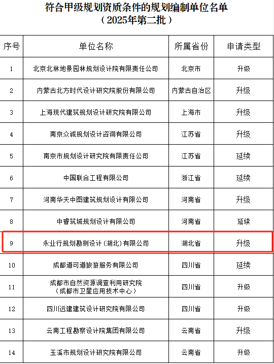 2025年3月3日,自然资源部发布《关于2025年第二批城乡规划(国土空间规划)编制单位甲级资质认定的公告》,永业行城乡规划编制资质成功晋升甲级!这一重要突破标志着永业行综合技术实力和行业影响力迈上新台阶,为全方位服务国家新型城镇化战略、深度参与城市高质量发展注入了强劲动能!