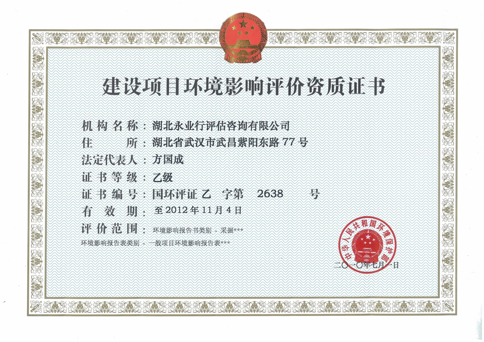 7月1日,国家环境保护部下达了《关于批准建设项目环境影响评价资质(2010年第五批)的公告》,其中,永业行环评资质经批准增加了采掘类环境影响报告书评价范围。