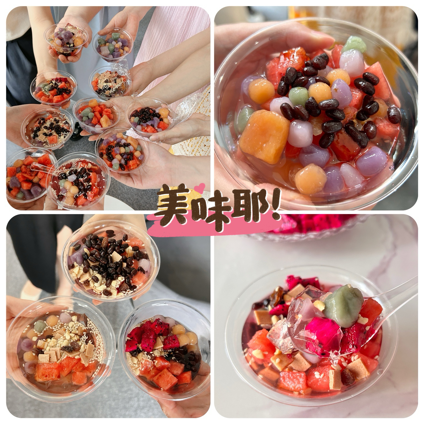 “我要多加芋圆!”“火龙果和西瓜最配~”“周五下午的快乐是冰粉DIY给的~”活动现场,小伙伴们秒变“甜品大师”,在五彩缤纷的配料区尽情发挥创意。糯叽叽的芋圆、香甜的水果……各种小料随心搭配,每一碗都是独一无二的“夏日限定”。